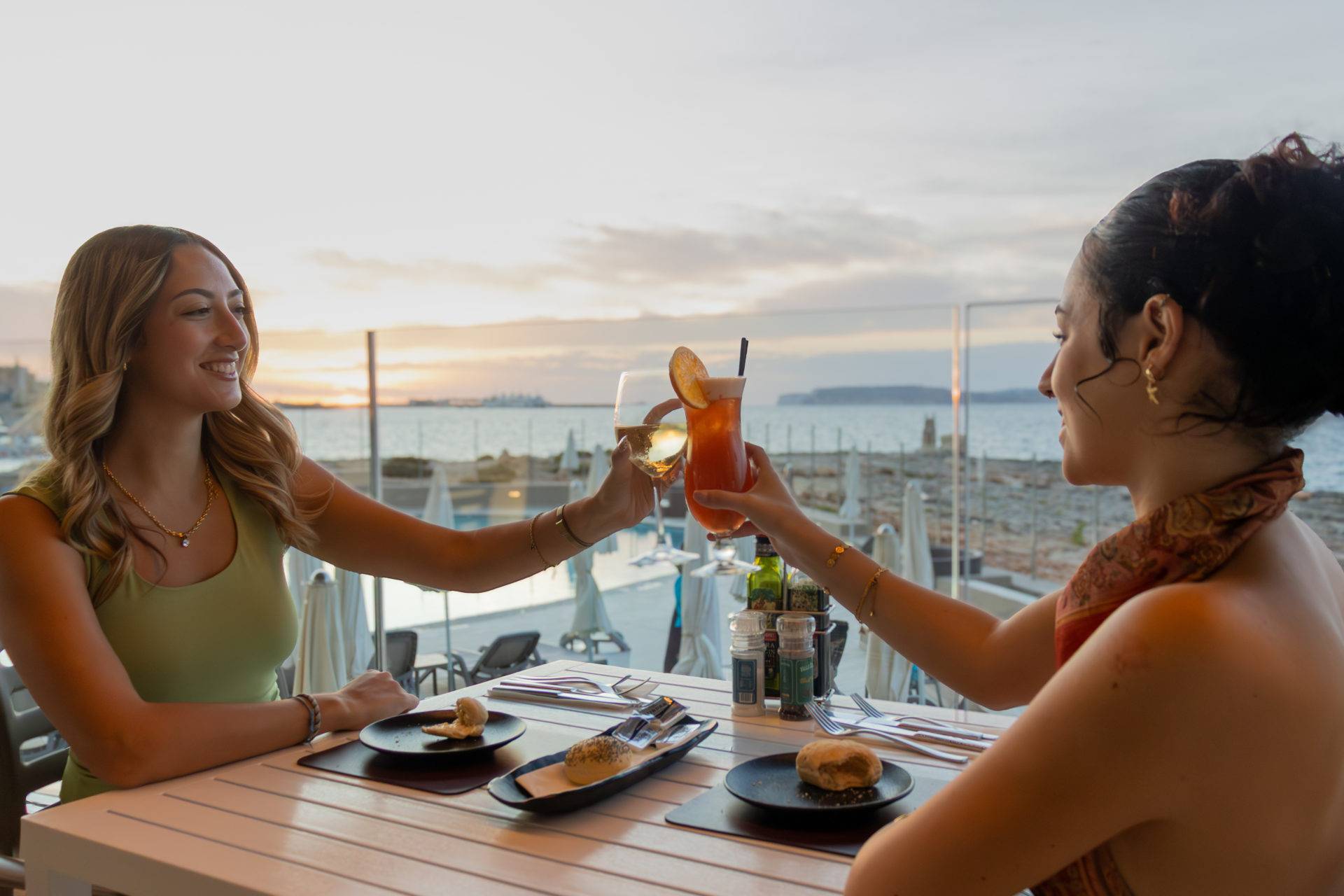 As the sun melts into the horizon, the water glows gold and laughter carries across the bay. Drinks in hand, toes in the sand, and friends gathered close—this is the spirit of summer at Ramla Bay. A place where every sunset feels like a celebration, and every evening begins with a toast to the sea.