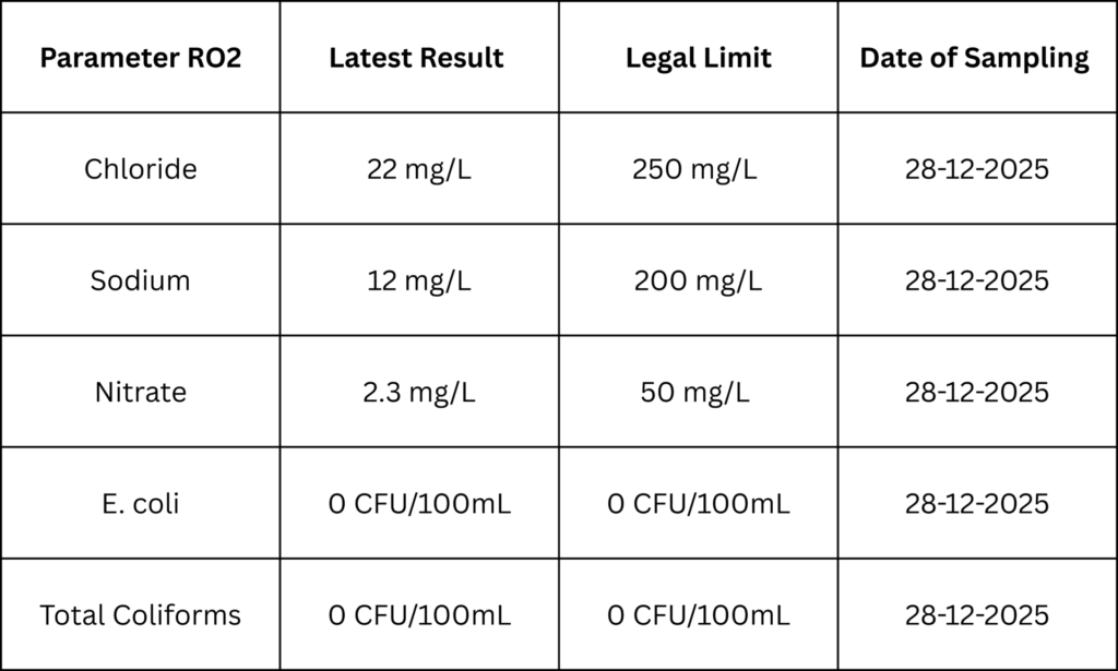 We regularly test the water for both microbiological and chemical parameters. These are some of the key indicators: